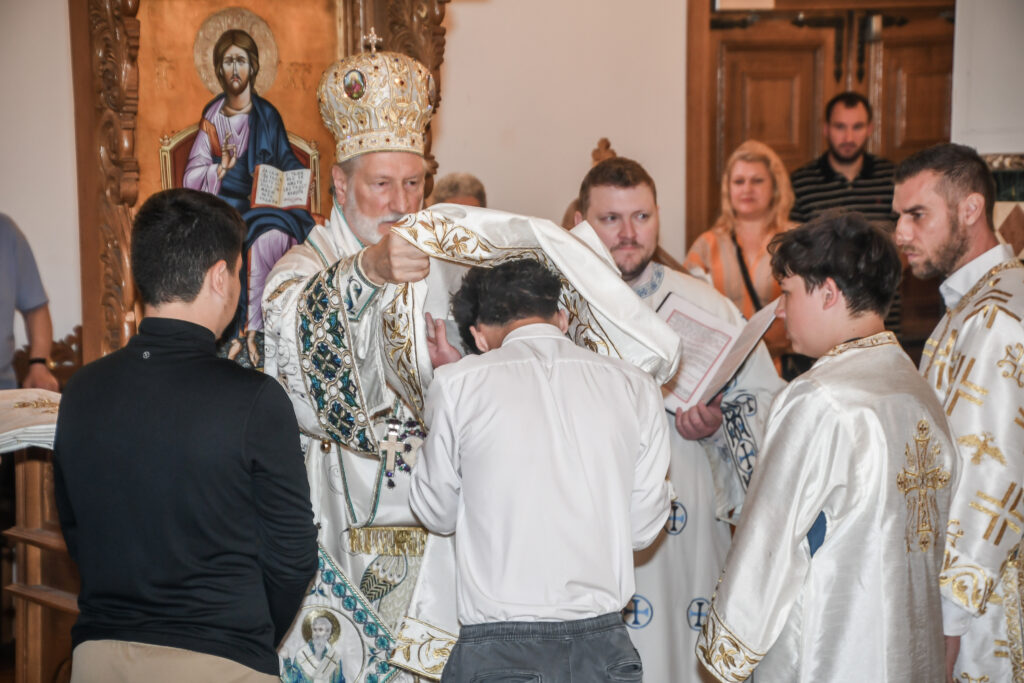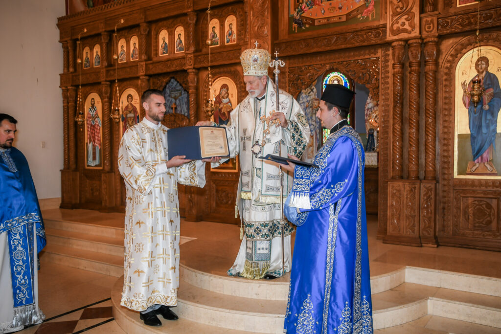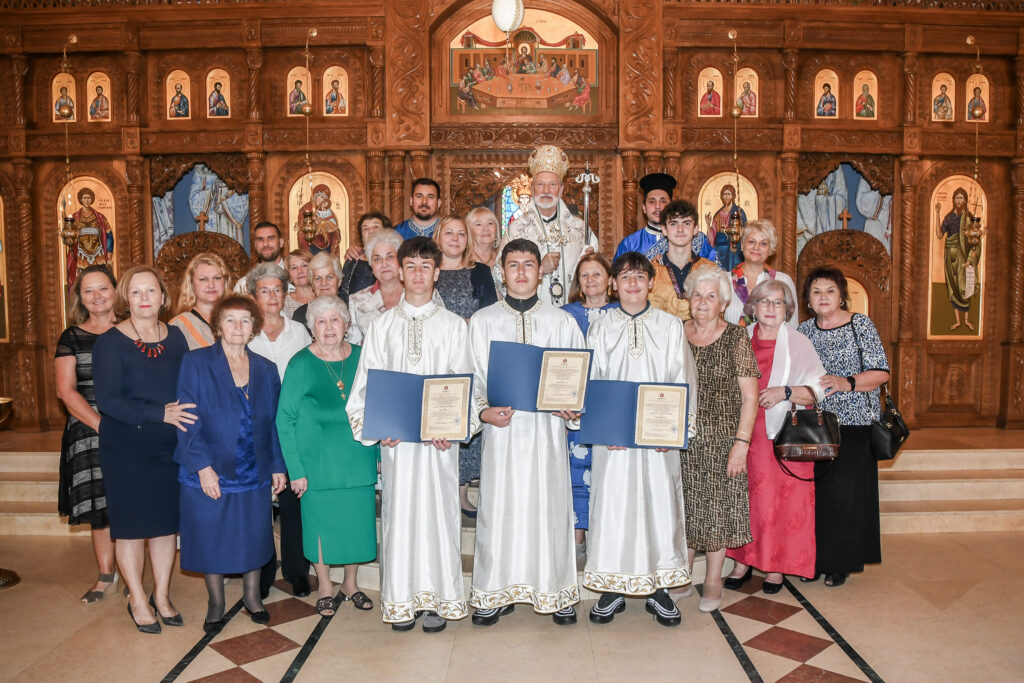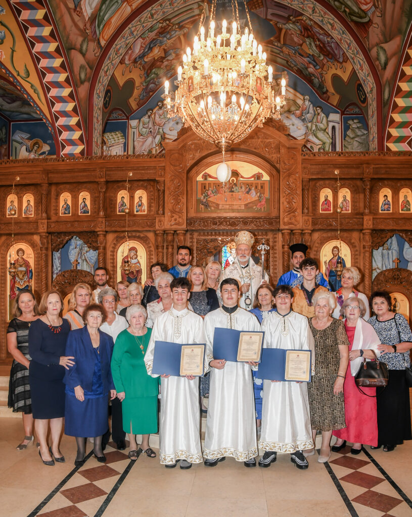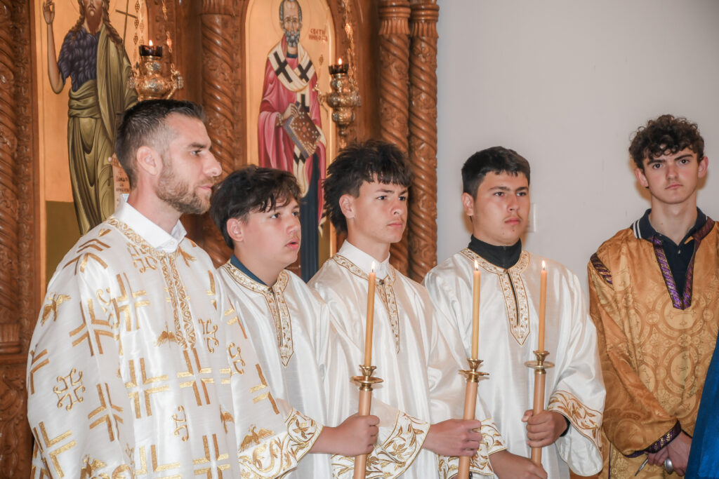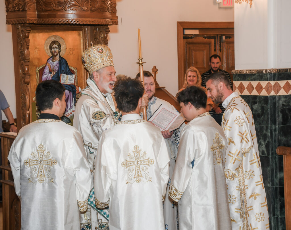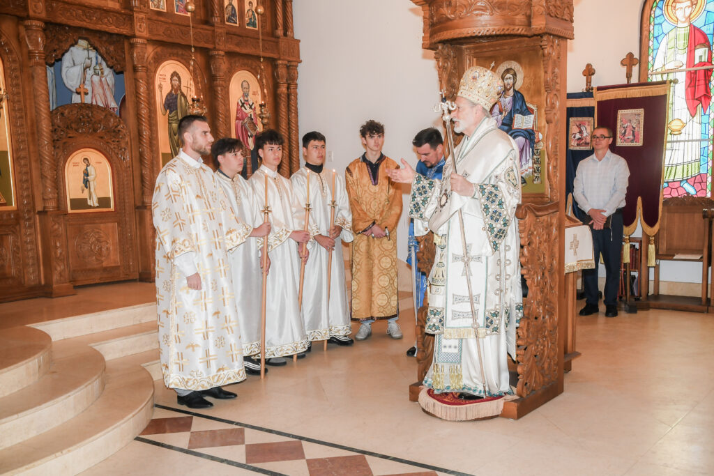 On this occasion, before the beginning of the Holy Liturgy, Bishop Irinej set apart three young gentlemen Vuk Veselinović, Maksim Ždralić and Luka Mutlak to the rank of acolyte, and tonsured Mr. Gjorgi Stojanov to the rank of reader. In his admonition following the elevations, His Grace congratulated the young men on their having been set apart, and wished them honorable and diligent service to their Church.